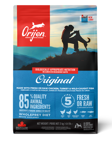 Loaded with the nourishing meat ingredients (80%) that mother nature evolved all dogs to eat, ORIJEN provides free-run chicken and turkey, whole eggs and wild-caught fish that are farmed or fished and delivered fresh to the Orijen factory, this allows the food to be preservative free, never frozen, and brimming with the proteins and fats that nourish your dog completely.