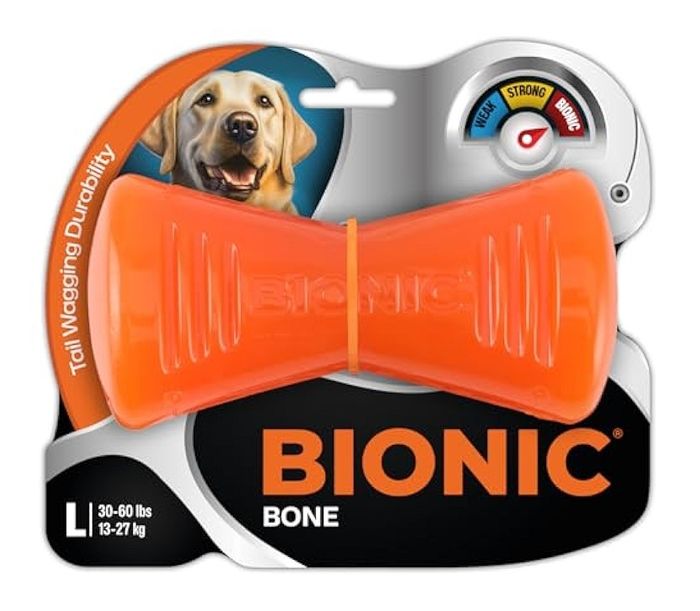 DURABLE AND SAFE PLAY: The BIONIC Bone offers texture and mouth feel that dogs love. Patented defensive geometry deflects incoming bite and chew forces for increased durability. It can bounce and float, making it great for fetch and outdoor play.