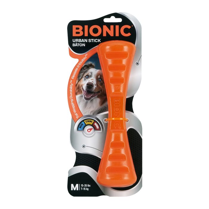 DURABLE AND SAFE PLAY: The BIONIC Urban Stick offers texture and mouth feel that dogs love. Patented defensive geometry deflects incoming bite and chew forces for increased durability and safety. It can bounce and float, making it great for fetch, tug of war, and outdoor play.
