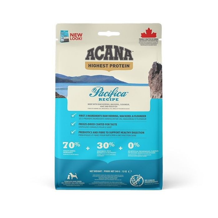 Made with a full 60% of nourishing fish, ACANA Pacifica matches your dog's evolutionary adaptation to a protein rich diet, and a variety of fresh, local fish reflects the diversity and freshness Nature intended your dog to eat.