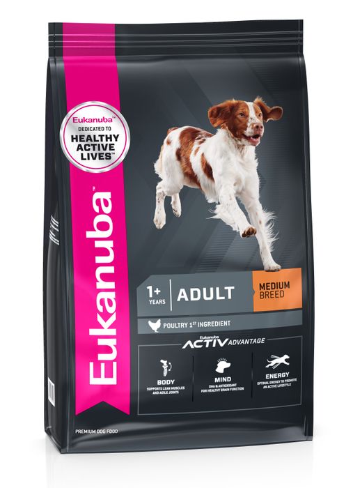 Eukanuba™ Medium Adult provides optimal nutrition for adult medium breed dogs (11 - 24 kg.) The kibbles are medium size and contain high quality ingredients such as poultry protein as our No 1 ingredient, fat, carbohydrates, fibres and important vitamins and minerals for the health and wellbeing of your adult all breed dog.