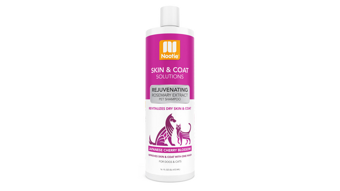 Nootie Rejuvenating Rosemary Extract Pet Shampoo • Revitalizes dry skin & coats • Rosemary Extract stimulates the follices, resulting in a strong and healthy coat • Made with natural ingredients • Soap free • SLS & Paraben free • No harsh chemicals • Safe to use along with topical flea and tick products • Safe to use on cats • Japanese Cherry Blossom • 473mL