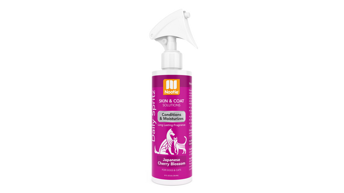Nootie - Daily Spritz • Conditions & moisturizes • Infused with the exhilerating scent of Japanese Cherry Blossom • Use to condition coat, moisturize skin and maintain fresh scent between washes • Made with natural ingredients • Conditions & moisturizes • Paraben free • No sulfates or harsh chemicals • Safe to use along with topical flea and tick products • Not tested on animals • Safe to use on cats • Best use with Nootie Shampoo • 236mL